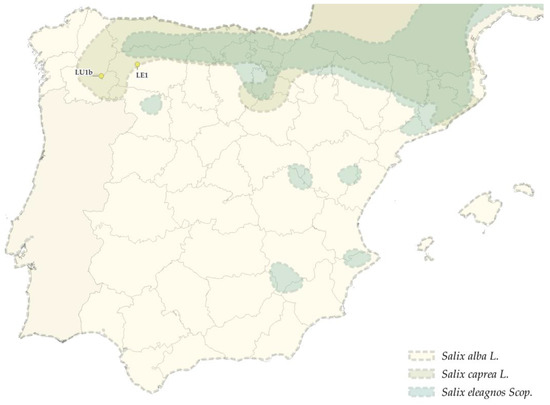 Distribution map of the species Salix alba L., Salix caprea L., and Salis eleagnos Scop. and location of the case studies identified as belonging to this species group. Map drawn up by the authors using information obtained from the database Chorological Data for the Main European Woody Species [42].
