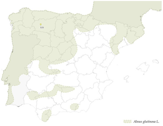 Distribution map of the species Alnus glutinosa L. and location of the cases identified as belonging to this species. Map drawn up by the authors using information obtained from the database Chorological Data for the Main European Woody Species [42].