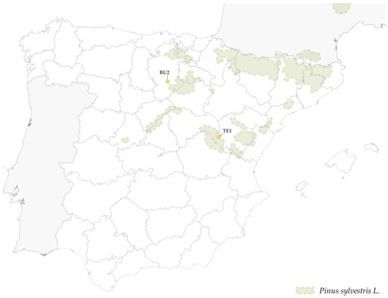 Distribution map for the species Pinys sylvestris L. and location of the case studies identified as belonging to this species. Map drawn up by the authors using information obtained from the database Chorological Data for the Main European Woody Species [42].