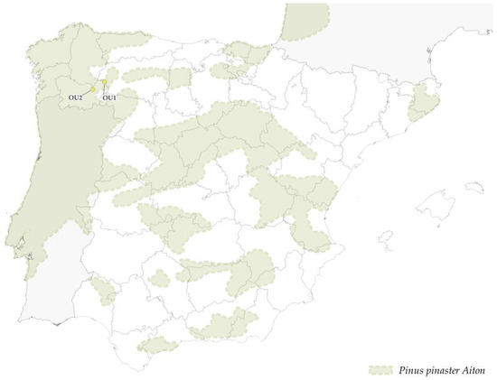 Distribution map of the species Pinys pinaster Aiton and location of the case studies identified as belonging to this species. Map drawn up by the authors using information obtained from the database Chorological Data for the Main European Woody Species [42].