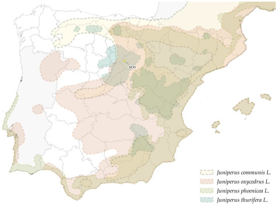 Distribution map for the species Juniperus communis L., Juniperus oxycedrus L., Juniperus phoenicea L., and Juniperus thurifera L. and locations of case studies identified as belonging to this species group. Map drawn up by the authors using information obtained from the database Chorological Data for the Main European Woody Species [42].