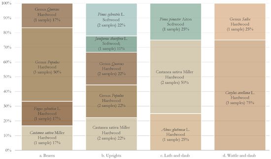 Consequently, the cross-analysis proposed in this text between the species identified and the different aspects of construction mostly aims to ascertain the reasons that may have prompted builders to select given species for the construction of particular elements. Equally, identifying the species used could help understand the frequency with which certain elements from the half-timber walls develop degradation phenomena such as rot or the attack of xylophagous insects [39,40].