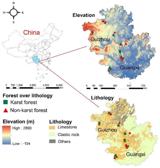 The study region was situated in the southwest Chinese provinces of Guizhou and Guangxi (between 22°34′ and 27°55′ N, 104°78′ and 108°65′ E). The study area is between 146 and 2890 m above sea level (from south to north). With a typical subtropical monsoon climate, its mean annual temperature (MAT) ranges from 12.6 °C to 21.8 °C and its mean annual precipitation (MAP) from 1013 mm to 1607 mm. Meteorological data (including temperature and rainfall) for 2000–2015 were obtained from the National Meteorological Information Center of China (http://data.cma.cn/, accessed on 20 June 2018). A karst region’s lithology is dominated by limestone, dolomite, and their mixtures, while non-karst regions’ are clastic.