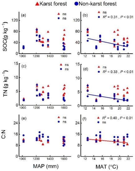 Relationships between mean annual precipitation (MAP) and temperature (MAT) and soil organic carbon (SOC), total nitrogen (TN), and the ratio of SOC to TN (C:N) in karst and non-karst forests. Relationship between SOC and MAP and MAT in karst and non-karst forests ((a,b), respectively), TN and MAP and MAT ((c,d), respectively), C:N and MAP and MAT ((e,f), respectively). ns, not significant.