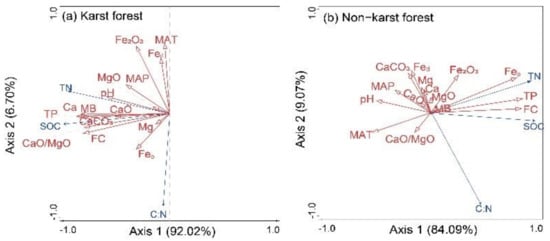 As shown in Table 1, soil pH was significantly lower in non-karst forests than in karst (p < 0.05). On average, the exchangeable Ca2+, Mg2+, and soil MB contents were about 4.3, 3.3, and 2.5 times lower in non-karst forests than in karst forests, respectively. Generally, CaCO3, CaO, MgO, Fe2O3, and CaO/MgO were significantly lower in non-karst forests than in karst forests (p < 0.05), whereas Fed and field capacity were not significantly different.