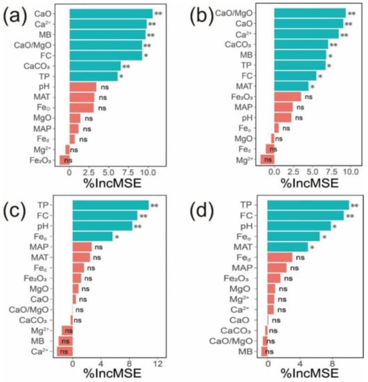 Relative importance of soil physicochemical properties in the variation of soil organic carbon and total nitrogen in karst ((a,b), respectively), and non-karst forests ((c,d), respectively). Importance was used to determine the percentage increase in mean square error of the random forest model. Ca, soil exchangeable Ca2+; Feo, amorphous iron oxide; Mg, soil exchangeable Mg2+; Fed, free iron oxide; MAP, mean annual precipitation; FC, field capacity; TP, total porosity; MB, microbial biomass; CaCO3, calcium carbonate; CaO, calcium oxide; CaO/MgO, the ratio of CaO to MgO; MgO, magnesium oxide; Fe2O3, ferric oxide; MAT, mean annual temperature. * represents p < 0.05. ** represents p < 0.01. ns, not significant.