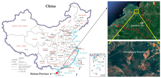 This study was conducted in the Mahuangling Watershed at the Mahuangling Soil and Water Conservation Monitoring Station (19°41′~19°47′ N, 109°24′~109°30′ E) (Figure 1), located in Danzhou City, Hainan Province, China. The region has a tropical monsoon climate, with a mean annual temperature of 23.5 °C. The mean annual precipitation is approximately 1815 mm, with about 80%~85% occurring from May to October. The soils are typical latosol soils that originated from granitic parent materials. Due to vegetation over-harvesting and deforestation from the 1960s to 1980s, soil erosion intensified in the already eroded area of latosol. In the 2000s, as a part of the State Key Forestry Ecological Projects, vegetation restoration was conducted within the gully erosion area, specifically consisting of eucalyptus–grass forest (E. robusta and P. distichum), bamboo–grass forest (Bambusa oldhamii and P. distichum), acacia–grass forest (A. mangium and P. distichum), and shrub–grass forest (Melastoma candidum, U. lobata, and P. distichum). These restoration efforts have proven to be successful in controlling soil and water loss, greatly improving the local environment. Moreover, this study site is now primarily covered by plantation forests. The understory consists of species of Urena lobata, Melastoma malabathricum, Chromolaena odorata, Lantana camara, Digitaria sanguinalis, and Paspalum distichum, and the forest coverage is more than 75% [41].