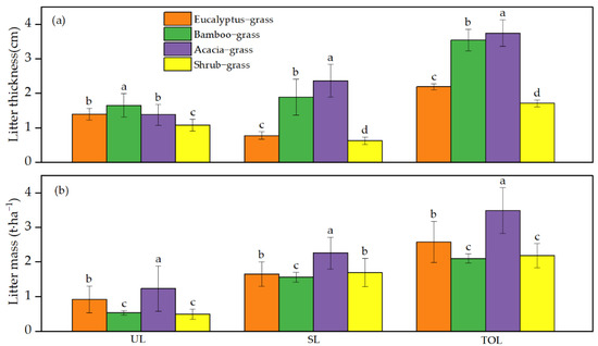 Variations in litter thickness (a) and litter mass (b) in the undecomposed litter (UL) layer and semi-decomposed litter (SL) layer of the forest type of eucalyptus–grass, bamboo–grass, acacia–grass, and shrub–grass. The different lowercase letters in each category indicate a significant difference among forest types.