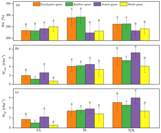The Rm in the SL layer was 292.88% ± 30.24% for the bamboo–grass forest and was not significantly different from the eucalyptus–grass forest (289.17% ± 33.21%). However, both were significantly greater than the acacia–grass forest (223.88% ± 37.78%) and shrub–grass forest (231.84% ± 38.20%) (p < 0.05) (Figure 3a). The Rm of the UL layer ranged from 232.94% ± 22.57% to 250.22% ± 20.05%, and no significant difference was found between the eucalyptus–grass forest and the bamboo–grass forest or between the acacia–grass forest and the shrub–grass forest (p > 0.05). The Rm of the bamboo–grass forest was 262.91% ± 21.46%, which is roughly equivalent to that of the eucalyptus–grass forest (261.51% ± 23.13%); both stands were significantly higher than those of the shrub-grass forest (241.03% ± 22.94%) and acacia-grass forest (232.95% ± 22.77%) (p < 0.05). The Rm of the SL layer was larger than that of the UL layer in the bamboo–grass forest and eucalyptus–grass forest, but the opposite trend was observed for the acacia–grass forest and shrub–grass forest.