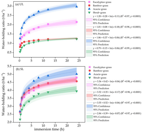 Logarithmic relationship between the water-holding ratio and immersion time of (a) undecomposed litter (UL) layer and (b) semi-decomposed litter (SL) layer of eucalyptus–grass, bamboo–grass, acacia–grass, and shrub–grass.