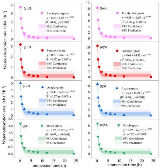 Exponential relationship between the water absorption rate and immersion time of the undecomposed litter (UL) layer for (a) eucalyptus–grass, (c) bamboo–grass, (e) acacia–grass, and (g) shrub–grass, and semi-decomposed litter (SL) layer for (b) eucalyptus–grass, (d) bamboo–grass, (f) acacia–grass, and (h) shrub–grass.