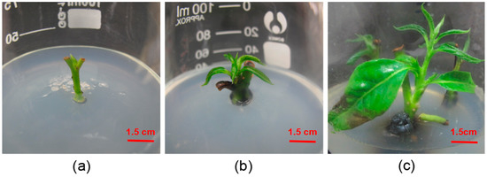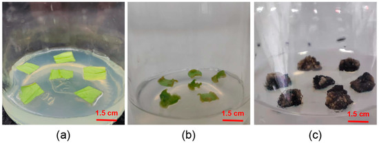 Process of leaves inducing calli. (a) Leaf discs connected to the culture medium after 5 days. (b) Callus leaf discs curled up after 10 days of culture. (c) Callus dimensions increase to 1.5 × 1.5 cm2 after 25 days.