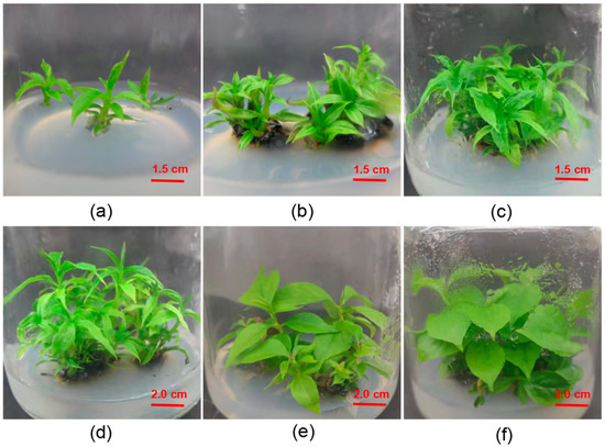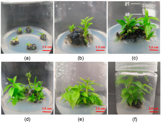 The induction of adventitious shoots is the most important step in leaf regeneration. Selecting a proper induction formula can effectively improve the induction efficiency and number of adventitious shots. From the results shown in Table 4 and Figure 3, the different concentrations of plant growth regulators showed significant differences in adventitious shoot induction of callus. In the process of callus-induced bud formation, the culture at 15 days exhibited a larger bud point (Figure 3a). Following bud formation, stem extension appeared after 5 days (Figure 3b). At 10 days, we observed leaf elongation accompanied by bud regeneration (Figure 3c). Single buds continued to grow taller and larger from 15 to 25 days (Figure 3d, e), with optimal bud growth observed at 30 days (Figure 3f). When the concentration of TDZ was 1.0 mg/L, the adventitious shoots induced by calli appeared yellow and had no obvious buds. At the same time, the overall multiplication coefficient and the rate of adventitious shoot induction were relatively low. When the TDZ concentration was 2.0 mg/L, the callus exhibited better overall growth, as well as large leaves and strong stalks; the overall multiplication coefficient and the adventitious shoot induction rate were higher. At a TDZ concentration of 3.0 mg/L, the overall callus growth of adventitious shoots was very poor and the leaves were small and curled; the overall multiplication coefficient and the adventitious shoot induction rate were very low. The best adventitious shoot induction rate occurred in 2.0 mg/L TDZ, 2.0 mg/L 2iP, and 0.5 mg/L NAA cultures, in which the rate approached 75.2% and the average number of adventitious shoots reached 7.9; the growth was incredibly strong, and the leaves were big and green. By comparison, the most suitable medium formula for callus induction from the leaves of D. lotus was the 1/2 MS medium, supplemented with 2.0 mg/L 2iP, 2.0 mg/L TDZ, 0.5 mg/L NAA, and 40 g/L sucrose.