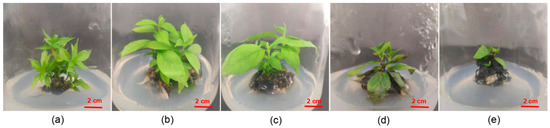 Subculture is an important way to obtain a large number of sterile saplings. Selecting a suitable culture method can effectively increase the multiplication coefficient and improve the growth of sterile saplings. Individual adventitious shoots were cut from the callus and inoculated into the culture medium as described in Table 7 (Figure 6a). When the callus contained no hormones, the indefinite stem grew slowly, and the multiplication coefficient was low. When the ZT concentration was held at a certain value, the multiplication coefficient and the average plant height increased at first after decreasing with the 2iP concentration. When ZT was 2.0 mg/L and IAA was 0.05 mg/L, the shoots showed strong growth at 10 days (Figure 6b). The growth after migration at 25 days and single-tufted stem growth after 15 and 30 days, respectively, are given in the remaining panels. When IAA was not added, the leaves in the medium were green. The culture medium most suitable for subsequent proliferation was 1/2 MS + 2.0 mg/L ZT + 2.0 mg/L 2iP + 0.05 mg/L IAA.