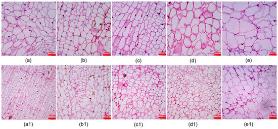 In the process of subculture of calli it was found that the texture of the same callus would change greatly after the induction of adventitious shoots. Therefore, we observed the morphological changes of the bud point callus cells using sections. From Table 6, the fourth generation of callus cells was 18, 17, and 17 fewer in number than the first(Figure 5a), second(Figure 5b), and third(Figure 5c) generations under a 12× microscopic field of view, respectively, with significant differences (p < 0.05). As the generation number increased from the fourth (Figure 5d) generation onward, the gap between the callus cells became larger, whereas the cells that were originally regularly distributed and similar in size became irregular and disorganized, especially the fifth generation (Figure 5e). Figure 5 a1–e1 shows the overall arrangement of the first to fifth generations of cells. From the fourth generation, the adventitious shoots of D. lotus callus grew weaker; thus, it was concluded that after three successive adventitious shoots from the same callus, the callus should be proliferated and cultured to induce robust adventitious shoots.