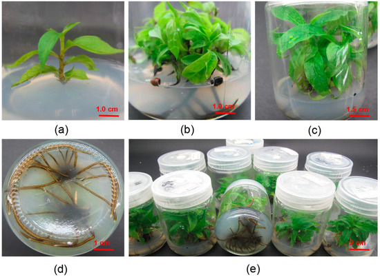 Rooting culture is an important step in factory sapling cultivation. Selecting a suitable medium can effectively improve the effect of rooting culture and increase the survival rate of saplings. Individual adventitious shoots were cut from the tufted stems and inoculated into the culture medium as described in Table 8 (Figure 7a). When the IBA concentration was 0.5 mg/L, the rooting rate and rooting number were lower as a whole; when the concentration of IBA was 1.0 mg/L, the rooting rate increased first and then decreased with the concentration of NAA. When the concentration of NAA was 0.5 mg/L, the rooting rate was relatively high; when the IBA concentration was 1.5 mg/L, the rooting rate and rooting number were lower as a whole. The study on the effect of IBA and NAA on rooting showed that when IBA was 1.0 mg/L and NAA was 0.5 mg/L, the rooting rate was higher as a whole; when the IBA was 1.0 mg/L and the NAA was 0.5 mg / L, with the increase in sucrose concentration, the rooting rate and rooting number first increase and then decrease. When the sucrose concentration was 20 g/L, the rooting rate and rooting number were the highest, and the growth was excellent. After 25 days of rooting culture, a large number of adventitious roots (Figure 7b) began to be produced. After 40 days of culture, the leaves were large and green (Figure 7c), the roots grew vigorously (Figure 7d), and the adventitious shoots of rooting culture grew very well overall (Figure 7e). Finally, the best culture and combination of root culture was 1/2 MS + 1.0 mg/L IBA + 0.5 mg/L NAA + 20 g/L sucrose.