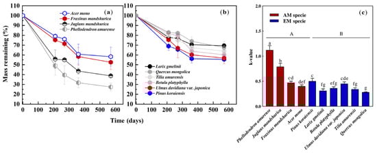 where X is the mass residue rate (%) at the decomposition time t (unit: annual), and k is the annual decomposition rate constant. The relationship between k and initial chemical components was analyzed by linear regression with Origin 2021 software. Figures were drawn with Origin 2021 software. All statistical analyses were conducted using SPSS 22 software. An independent–sample t-test was used to analyze significant difference between AM and EM. Differences in initial composition between species were obtained by one–way ANOVA. Pearson’s correlation coefficients were used to examine the bivariate correlations between functional traits. We examined species and mycorrhizal interactions using two–way ANOVA. A mixed linear model was used to explain the effects of initial chemical elements on the decay constants of 10 species at different plots.