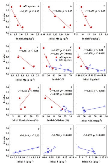 (a–l) Regression relationship between decay constants (k–value) and initial aluminum (Al), manganese (Mn), iron (Fe), magnesium (Mg), carbon:nitrogen ratio (C:N) ratio, phosphorus (P), calcium (Ca), non–structural carbohydrate (NSC), and sulphur (S) concentrations in 4 AM and 6 EM species. The linear relationship between the initial element and AM species is shown by the red line. The linear relationship between the initial element and the EM species is shown by the blue line. The r in the subfigures represents the correlation coefficient and p stands for correlation significant on layer 0.1, 0.01, 0.001 and 0.0001.