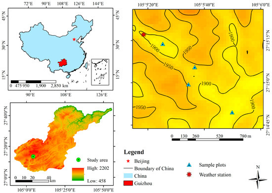This study was conducted at the Bijie Salaxi, Guizhou, China (105°01′10″–105°08′39″ E, 27°11′08″–27°17′30″ N), and belongs to the Liuchong River basin in Qixingguan District, with a total area of 86.27 km2 and an annual average temperature of 12 °C (Figure 1). It has a humid subtropical monsoon climate, with an altitude of 1509~2180 m and abundant rainfall. The annual average rainfall is 984 mm, but the rainfall distribution is uneven and mainly concentrated in the months of May to September. The karst area accounts for 74.25% of the total area of the study area, and potential, mild, moderate and severe karst desertification are all distributed in the study area. The topography of the study area is fragmented, and the soils are predominantly yellow soil with a small proportion of yellow-brown soil. The native vegetation in the area mainly includes Masson pine forest, rhododendron forest, grassland, etc., but human disturbance has basically destroyed the native vegetation. The primary vegetation in the area mainly consists of Pinus massoniana, Rhododendron and grasslands, but human disturbance has basically destroyed the primary vegetation, and the plants are mainly secondary vegetation, the economic forests are mainly planted with Juglans regia and Ribes burejense, and the crops are mainly Zeamays and Solanum tuberosum [28].