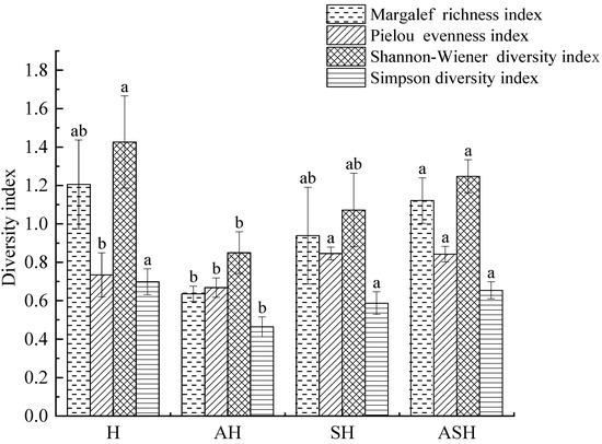 According to the survey results (Figure 2), it can be seen that the Margalef richness index (R), Shannon–Wiener diversity index (H′) and Simpson diversity index (D) of different plant community structure types showed H > ASH > SH > AH. The Margalef richness index (R) and Shannon–Wiener diversity index (H') of ASH were significantly higher than that of AH (p < 0.05), and the Shannon–Wiener diversity index (H′) and Simpson diversity index (D) of H were significantly higher than that of AH (p < 0.05). Although the richness index and diversity index of H were higher, the plant community structure was relatively simple, and the vertical stratification of the community was not obvious. The Simpson diversity index (D) for SH and ASH differed from AH in a statistically significant way. In terms of the Pielou evenness index (E), plant community structure types showed SH > ASH > H > AH. The Pielou evenness index (E) of SH and ASH was significantly higher than that of AH and H (p < 0.05).