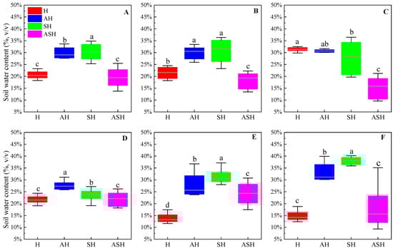 Comparison of soil water content for 0–70 cm. (A) 0–70 cm, (B) 0–10 cm, (C) 10–20 cm, (D) 20–30 cm, (E) 30–50 cm, (F) 50–70 cm. Different lowercase letters indicate significant differences of soil water content in the different plant community structure types of the same soil layer (p < 0.05).