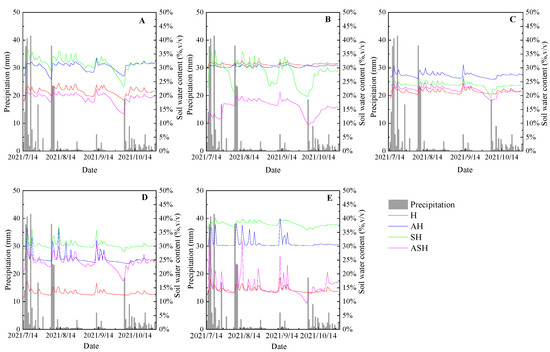 Daily variations of soil moisture content for 0–70 cm. (A) 0–10 cm, (B) 10–20 cm, (C) 20–30 cm, (D) 30–50 cm, (E) 50–70 cm.