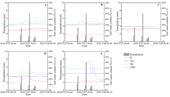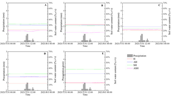 The variations of soil moisture content at moderate rain event. (A) 0–10 cm, (B) 10–20 cm, (C) 20–30 cm, (D) 30–50 cm, (E) 50–70 cm.