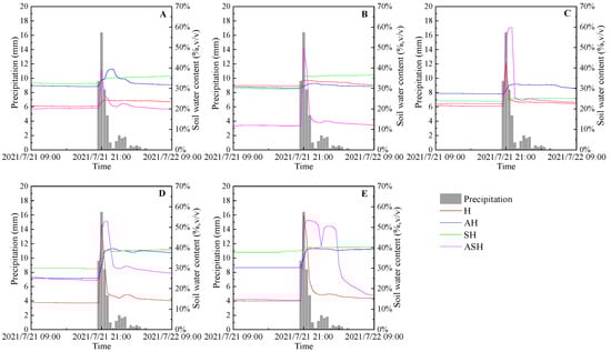 The variations of soil moisture content at heavy rain event. (A) 0–10 cm, (B) 10–20 cm, (C) 20–30 cm, (D) 30–50 cm, (E) 50–70 cm.