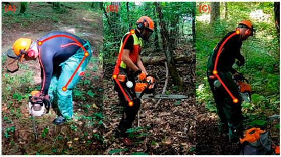 During forestry work, the anatomical structures of the worker’s body are exposed to static and dynamic “strains” that result in biomechanical stress. According to some researchers, while working in logging operations, workers are exposed to a high level of physiological [8] and physical stress and possible musculoskeletal disorders [9]. In addition, musculoskeletal disorders (MSDs) can occur as a result of acute trauma (slip, accident, fall, blow, etc.) or cumulatively as a result of long-term exposure to static and/or dynamic stress. In contrast to an acute injury, overexertion syndrome is of a chronic nature because repeated trauma over time overcomes the tissue’s ability to regenerate (tendons, bones, cartilage, mucous membranes, or muscles) [10]. Further, musculoskeletal disorders often appear in the form of pain and limited mobility in limbs or parts of the body [11] and can therefore have major implications for the general health of an individual, i.e., work safety in high-risk industries such as logging operations in forestry. The exposure to vibration and extreme temperatures is also a contributing factor [12,13], and as such, motor-manual work in forestry can often result in the development of MSDs. There are incorrect work techniques and recurring musculoskeletal pain that might cause reflex posture changes, leading to distortions of body coordination and stability, thus increasing the risk of accidents [14].
