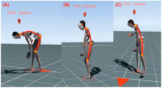 Avatar CoM display from MVN Analyzer Pro for three methods of starting the chainsaw (the orange dot shows the position of the subject’s CoM); ((A) from the ground method, (B) between the knees method, (C) “drop starting” method).