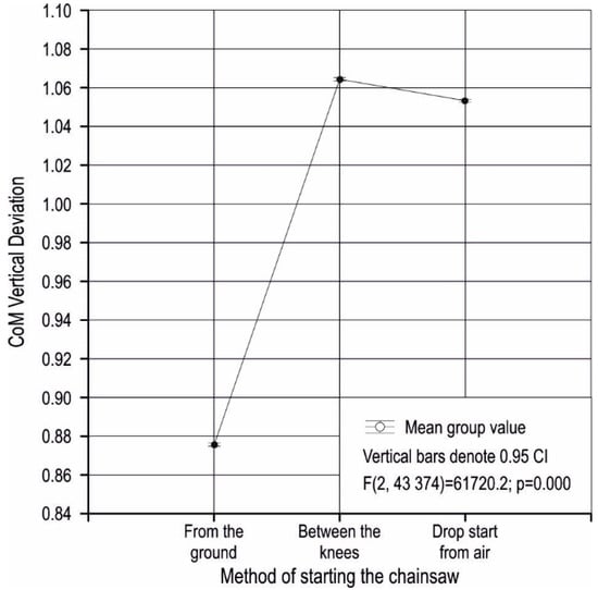 The CoM vertical deviation, when taking a position to perform a certain work element in the production process, represents an important link regarding the risk of imbalances and postural impairments in workers. Performing a particular work element is additionally risky when using or starting a hand-operated machine tool, such as a chainsaw (Figure 2). Accordingly, difference testing was performed between the CoM vertical deviation and two descriptive variables (Figure 3 and Figure 4) on a sample of 43,377 recorded frames (1 frame represents 14 milliseconds of data recording).