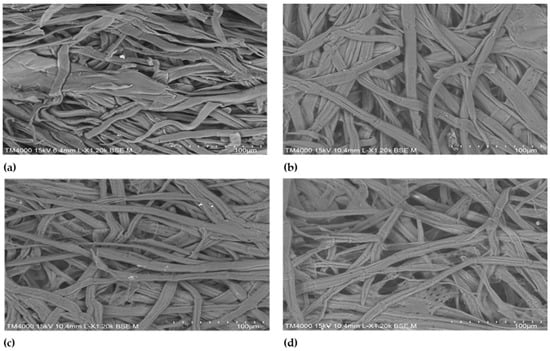 Sampling for SEM analysis began by suspending pulp in 2 mL of distilled water at 1% consistency, followed by homogenisation. Afterwards, the sample was centrifuged at 3000× g rpm for 5 min, and after discarding the supernatant, it was left to dry at room temperature. Air-dried samples were attached to a support with carbon tape and then subjected to analysis in a Hitachi TM4000plus scanning electron microscope at 15 kV of accelerating voltage (Tokyo, Japan).