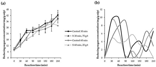 Cumulative (a) and fractional (b) reducing sugar release during the enzymatic peeling treatments.