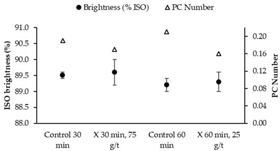 Additionally, both enzymatic treatments improved brightness stability (lowered PC number), especially the longer one (PC number decreased from 0.21 to 0.16), meaning that X duration might positively affect brightness stability. A reduction in the PC number caused by the xylanase treatment is also commonly reported [34,35,36].