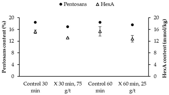 HexA content in the original pulp was 58.0 mmol/kg. The HexA content of enzyme-treated pulps was lower than that of untreated pulps as a result of their removal (Figure 4). As aforementioned, some of the xylan fragments that are released from the pulp by xylanase may contain HexA groups, thus explaining their lower amount in enzyme-treated pulps. Unlike pentosans, the HexA fraction shows changes during the chemical bleaching sequence because of its oxidation by ClO2 during the D stages, which leads to HexA removal from the pulp. However, since in the enzyme-assisted bleaching sequences, a lower ClO2 was applied, there should be less removal of HexA resulting from the action of ClO2 alone. Thus, the drop in the HexA content of enzyme-treated pulps can only be attributed to the xylanase treatment. Indeed, the removal of HexA from the pulp by xylanase action is often reported [29,34,38]. The data for HexA content is also in accordance with the brightness stability results presented in Figure 3: a lower HexA content corresponds to a lower PC number, which means a higher brightness stability. The pulp subjected to the longer enzymatic pre-treatment is the one that showed the greatest brightness stability improvement, and it is also the one for which the drop in HexA content seems more significant. This consolidates the idea of a direct relationship between HexA content and brightness stability.