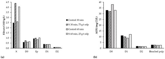 The bleaching effluents were analysed with respect to their COD and AOX levels (Figure 5). COD is an indicator of the total amount of organic species (dissolved or suspended) in the filtrate, while AOX gives the concentration of organochlorinated species that originate from the application of chlorine-based bleaching chemicals, which are considered environmentally hazardous. COD was expected to rise in the filtrates of the X treatments as a result of the release of xylan fragments from the pulp. The COD value of the filtrate/liquor from the initial pulp was 1.9 g/L, which means that the control treatments caused some release of organic material from the pulp (0.6 g/L by the 30 min control and 0.7 by the 60 min control). A great COD increase was indeed observed in the filtrates from both X treatments compared to the control ones, especially from the high-load treatment (1.9 g/L increase). This was expected, considering the higher pentosan content drop (Figure 4). The 60 min X treatment increased the COD by 1.4 g/L. COD increases in the filtrate from the X treatment are generally reported [38,45]. An increase in COD could have a positive effect from the point of view of the mill since a higher COD presumes a higher potential for energy recovery through the concentration and burning of the filtrate in a recovery boiler. On the other hand, it could overload an already overcharged energy recovery system and cause serious operational issues. Increased COD in X treatments is also a clear indicator of pulp yield loss, which means decreased mill productivity. The impact on COD of the filtrates from the following bleaching stages does not seem significant, though it tends to be higher in the D0 and EP filtrates from the bleaching sequences containing the enzymatic stage. This might be a result of the increased extractability of lignin degradation products and/or of the lower ClO2 load applied in the D0 stage since less material might have been oxidised by this agent in that case.