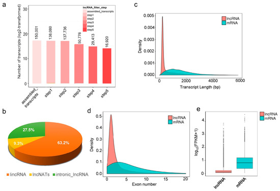 Identification and characteristics of lncRNAs in the seeds of yellowhorn. (a) Number of lncRNAs identified in five screening steps. (b) Classification and percentage of lncRNAs. (c) Transcript length distribution of identified lncRNAs and mRNAs. (d) Exon number distribution of identified lncRNAs and mRNAs. (e) The overall FPKM value of identified lncRNAs and mRNAs.