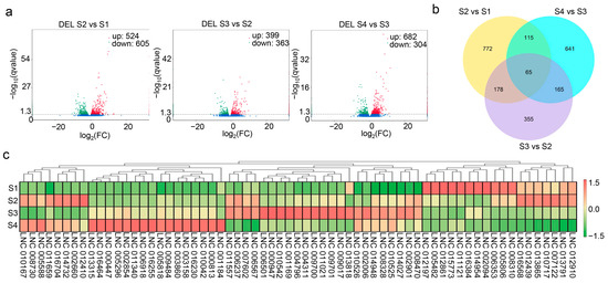 Differentially expressed lncRNAs and their expression profiles. (a) Identified differentially expressed lncRNAs (DELs) in S2 vs. S1, S3 vs. S2, and S4 vs. S3. (b) Venn diagram of DELs in all three comparisons. (c) Heatmap of the expression levels of 65 DELs that existed in all three comparisons.