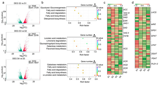 Identification and KEGG analysis of differentially expressed mRNAs (DEGs). (a) Identified DEGs in S2 vs. S1, S3 vs. S2, and S4 vs. S3. (b) KEGG pathway analysis of the DEGs in the context of FA and TAG biosynthesis. (c) Heatmap of the expression levels of DEGs in the FA biosynthesis pathway. (d) Heatmap of the expression levels of DEGs in the TAG biosynthesis pathway.