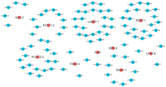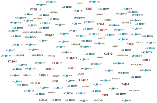 To identify DEL–DEG pairs related to FA and TAG biosynthesis, the DELs that interacted with the 67 DEGs extracted above were excerpted from 501,286 DEL–mRNA trans-regulatory pairs obtained earlier. In total, 325 DELs were suggested to interact with 58 DEGs, forming 1712 gene pairs (Table S5, Figure S3). As the DEL–DEM interaction network is very complex and large, a subnetwork including five key DEGs in FA (ACC-3, ECR-2, FAD3-2, KAR, KCS11-2) and five key DEGs in the TAG pathway (LPAT-6, LACS7-1, DGAT-1, PLD1-2-2, PDAT-1) was selected for display (Figure 6). In most cases, a DEG can be simultaneously regulated by multiple DELs. There are also cases where one DEL regulates one DEG. For example, KAR is targeted only by LNC_003993.
