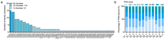 We identified 713 mature miRNAs, including 428 known mature miRNAs belonging to 65 miRNA families and 285 novel mature miRNAs (Table S8). The most abundant miRNA family was miR169, containing 15 members, followed by miR156 and miR166, which both include 14 members. The remaining miRNA families all harbored fewer than ten members (Figure 7a). The TPM value in S1–S4 showed a similar distribution, with a TPM value >15 accounting for almost half (Figure 7b).