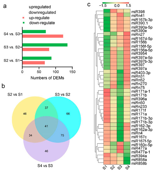 Differentially expressed miRNAs (DEMs) and their expression profiles. (a) Identified DEMs in S2 vs. S1, S3 vs. S2, and S4 vs. S3. (b) Venn diagram of DEMs in all three comparisons. (c) Heatmap of the expression levels of 41 DEMs that existed in all three comparisons.