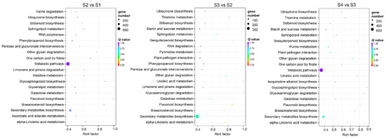 KEGG enrichment pathway analysis of DEMs in S2 vs. S1, S3 vs. S2, and S4 vs. S3. The top 20 KEGG pathways of DEMs are displayed.