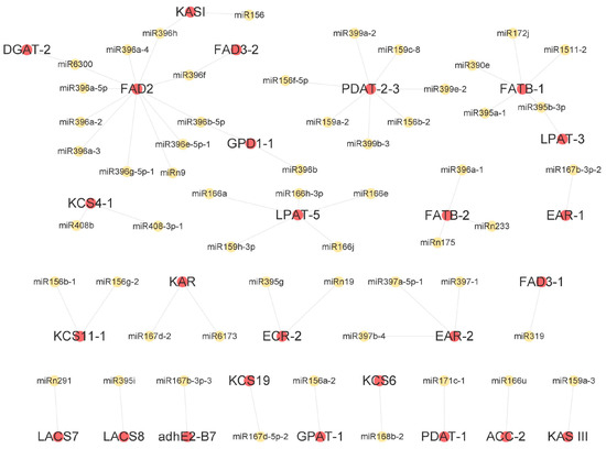 A total of 38 pairs consisting of 35 DEMs and 14 DEGs were found to be associated with FA biosynthesis (Figure 10). The 14 DEGs included KAR, EAR, KASI, FATB, FAD2, FAD3, KCS, and ECR. FAD2 is targeted by the most DEMs, including nine miR396 family members and miR6300. In contrast, Wang et al. predicted that miR319p_1 targeted FAD2-2 in yellowhorn (cultivar NM1203 and NM1003); Zahra et al. reported that 47 wheat FAD genes were targeted by 91 miRNAs, but these did not include miR396 or miR6300 [42]; in sesame seed, FAD2 was revealed to be targeted by sly-miR166c-5p_1 and involved in lipid biosynthesis [43]. This may indicate that miRNAs targeting FAD2 vary among different plants or cultivars.