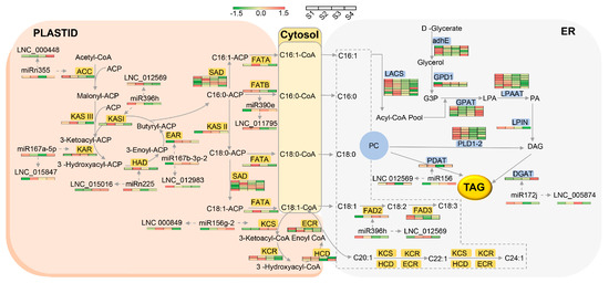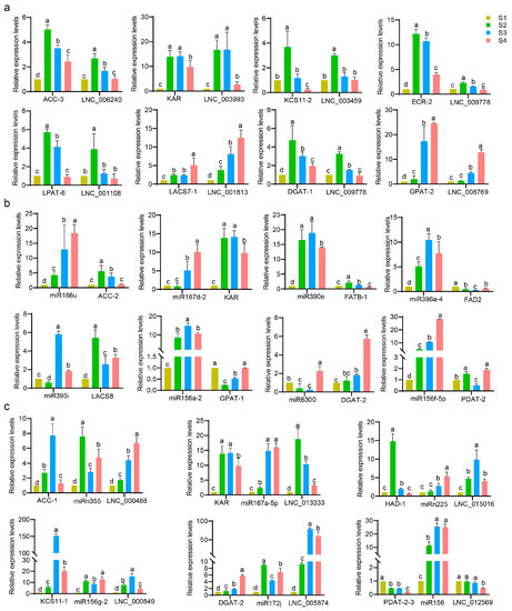 Expression patterns of the selected lncRNA–mRNA pairs, miRNA–mRNA pairs, and lncRNA–miRNA–mRNA modules in the context of the FA and TAG biosynthesis pathways. The gene pairs in the upper half of (a,b) are involved in FA biosynthesis pathways, the lower half of (a,b) are pairs involved in TAG biosynthesis pathways. In (c), the ACC-1–miRn355–LNC_000488, KAR–miR167a-5p–LNC_013333, HAD-1–miRn225–LNC_015016, and KCS11-1–miR156g-2–LNC_000849 modules were suggested to be relevant to FA biosynthesis pathways, and DGAT-2–miR172j–LNC_005874 and PDAT-2-3–miR156–LNC_012569 were suggested to be relevant to TAG biosynthesis pathways. Data from qPCR experiments were analyzed using Duncan’s multiple range test. Significant differences (p-value < 0.05) are indicated by different lowercase letters.