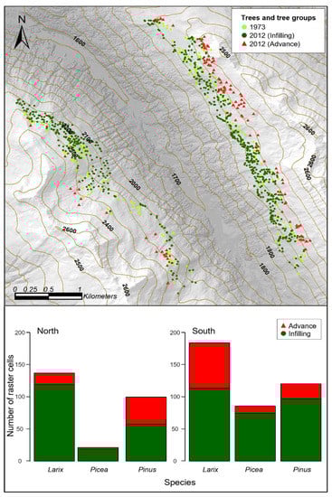 Upper panel: forest change in the study region derived from terrestrial mapping of trees and tree groups at treeline. A moving window analysis was used to discriminate between treeline advance and infilling below treeline. Light green circles represent trees or tree groups that were already present in the treeline ecotone in the 1972 survey. Red triangles represent individual trees and tree groups classified as advance, and dark green circles are trees and tree groups classified as infilling. Classification was calculated at a 50 m pixel resolution using a neighborhood elevation analysis comparing position of trees and tree groups in 2012 (dark green and red symbols) to 1972 (light green circles). Lower panel: classification of the trees and tree groups that established in the time interval between the two surveys (1972–2012). Bars represent the number of raster cells with trees classified as advance or infilling on the two valley slopes separated by species.