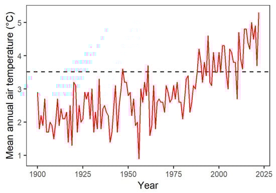 Mean annual air temperature at 2 m height (1900–2022) at the MeteoSwiss weather station in Davos at 1594 m a.s.l. The dashed horizontal line represents the corresponding value for the climate norm period 1981–2010 (source: MeteoSwiss).