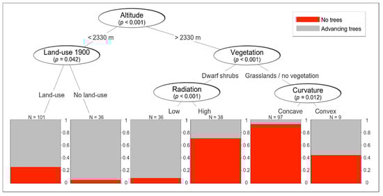 Only five of the 13 variables considered as potential drivers for the advance of trees in a multivariate decision tree analysis were found to be significant (p < 0.05). Advance occurred at elevations above 2330 m a.s.l. mainly on microsites without dwarf shrub vegetation (i.e., alpine meadows or microsites without vegetation cover) or where dwarf shrubs occurred on microsites with high radiation (Figure 5). Below 2330 m, historical land use was the most important driver of tree establishment with higher rates of establishment where land use was present in 1900. Current land use had no significant effect on treeline advance.