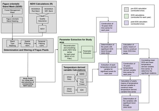 Google Earth Engine (GEE, [102]) was used to obtain surface reflectance and climate datasets for preprocessing surface reflectance data and for index calculations. The forest management map of Turkey was prepared as polygon masks in the QGIS environment. All other processes including extent masking for Fagus orientalis, time series smoothing and reconstruction, statistical analyses, and visualizations were conducted in the R environment (R version 3.2.0, R studio version 1.2.1335, [103]). All study steps including data acquisition and storage were conducted with a personal desktop PC running Windows 10. A work flow chart of the study is given in Figure 1.