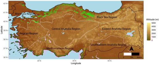- Atalay, İ. Vegetation Geography of Turkey; Ege Üniversitesi Basımevi: İzmir, Türkiye, 1994. [Google Scholar]